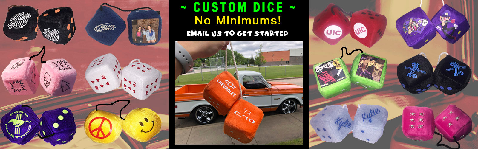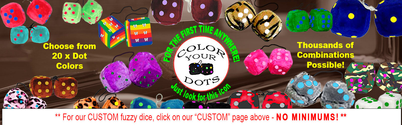 - In addition to offering our exclusive "Color-Your-Dots" availability, we are also providing a PERSONALIZATION and CUSTOM LOGOING service for your fuzzy dice with NO MINIMUM QUANTITY! Whether you're looking for one pair for that special someone, or a corporation looking to promote your brand, we'll be happy to meet your needs!