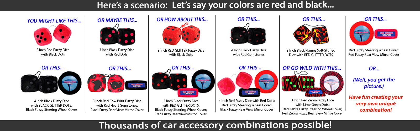 - For the first time ANYWHERE, thousands of car accessory combinations are now possible with our new "Color-Your-Dots" service offering! Choose from DOZENS of DOT COLORS to create your own custom dice, and match your car perfectly, inside and out!